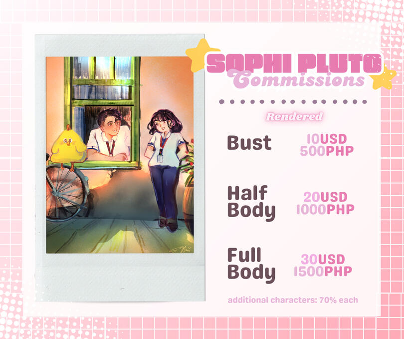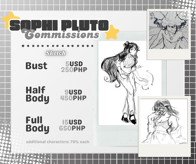 I, Sophi Pluto:-- I reserve the right to cancel and refund the order at any time for any reason.-- I retain all copyrights over the commissioned artwork.-- I will NOT claim the intellectual property (IP) of the commissioned artwork.-- I will NOT profit further from the commissioned artwork unless you (the customer) break any of the terms.-- I reserve the right to post the commissioned artwork online, in my portfolio as well as in publications such as art books.You (the customer/commissioner):-- You may upload the commissioned artwork on any website and social channels.-- You may NOT make profits from the commissioned piece (reselling, redistributing, uploading to POD-services, make prints, etc.)You may NOT alter the commissioned artwork without my (the artist's) consent.-- You MAY be allowed to sell the artwork if it is a part of an Adoptable. Please discuss this with me prior to paying for the artwork.-- You retain the rights to the intellectual property (IP).-- You may NOT use the commissioned artwork for commercial purposes.1. GENERAL TERMS➼ All drawings may or will include a subtle sign that you may not remove.➼ Prices are subject to change.➼ I have the right to reject any order that I do not feel comfortable drawing for any reason.2. PAYMENT➼ Currency accepted is either USD or PHP and can be paid through PayPal or GCash.➼ Commissions can be paid either 100% upfront or split 50% upfront and 50% after sketch approval.➼ Don't send me any payment before I have agreed to give you a slot and requested you to send me the payment.3. PROCESS AND DELIVERY➼ I will notify you when I have started on your commission and you, therefore, lose the rights to a refund (see point 7 further below for more info on refunds)➼ While I'm working on your commission I will make reviews with you to make sure I make it just right for you!➼ The amount of reviews depends on the complexity of the work.➼ During the reviews, you will see work-in-progress and these images will usually include a watermark and be smaller than the finished piece.➼ The time it takes to finish your commission varies 1 week - 1 month depending on factors such as health, the complexity of the commissioned piece, other work and con seasons.➼ If anything comes up that will slow the progress of the initially estimated delivery time I will let you know asap.➼ Once the piece is finished you will receive the full-resolution image. Note that there is no physical product.4. REVISIONS➼ You get 3 rounds of changes on the commissioned piece included in the price.➼ A fee will be added if you want something changed on the final drawing - unless a misunderstanding from my side has been made.➼ If you wish for me to change something in the drawing you have previously approved, I will charge you a fee to change it. The amount of the extra charge depends on the change you want me to make and is usually based on an hourly wage.➼ If your reference is unclear to start with changes will come at an extra charge.5. CUSTOMER SATISFACTION➼ I will do everything I can to make my customers happy!➼ If you have a problem with anything in regards to the commissioned piece please tell me right away so we can find a solution together.➼ I am willing to change some of my terms for you if you ask before I start on your commission. If you, e.g., do not want me to post your art anywhere, we can discuss this.6. REFUND / CANCELLATION POLICY➼ The buyer is not allowed a refund once I started working on the commission.➼ If for any reason I am unable to start your commission you will receive a full refund.➼ If you cancel your order before I started it, you can get a full refund.➼ If you are getting a refund, do not request a Paypal chargeback. I will transfer the money back to you myself.➼If you request a Paypal chargeback at any point when you were not allowed to ask for a refund you will lose all before mentioned rights to the commissioned piece and I will have the full right to profit further from it in any way. I will decline the chargeback and supply Paypal with our conversations in which we talk about the commission as evidence that I have completed work for you. Furthermore, you will be blacklisted for commissioning me again.➼ If the buyer breaks any of the points stated above they will lose all the before mentioned rights to the artwork commissioned by me,Sophi Pluto , and I will have the right to profit further from the commissioned artwork in any way I see fit. If you have a problem with any of these statements, they may be changed if discussed with me prior to paying your commissioned piece.7. COPYRIGHT / USAGE POLICYI, Sophi Pluto, claim the rights to the produced drawing, not the buyer. Therefore I am allowed to use the copyrighted artwork to:➼ Promote myself with it everywhere➼ Publish books with it (artbooks, etc.)➼ Display it everywhere to my liking (website, social media, etc.)➼ Post it wherever I wantThe buyer is allowed to:➼ Use the commissioned piece for personal use unless agreed otherwise (you can upload it on all your social media profiles, forums, etc.)➼ Print the artwork and claim the character(s) as their own, but not the artwork itself.➼ Use the artwork to promote themselves.The following is considered copyright infringement:➼ Reproducing/using the copyrighted artwork commercially - means making money off it in any way.➼ Claiming the artwork as your own➼ Removing my signature from the artwork➼ Altering the artwork without my consentI reserve the full rights to the image and it's use/distribution unless otherwise agreed upon.